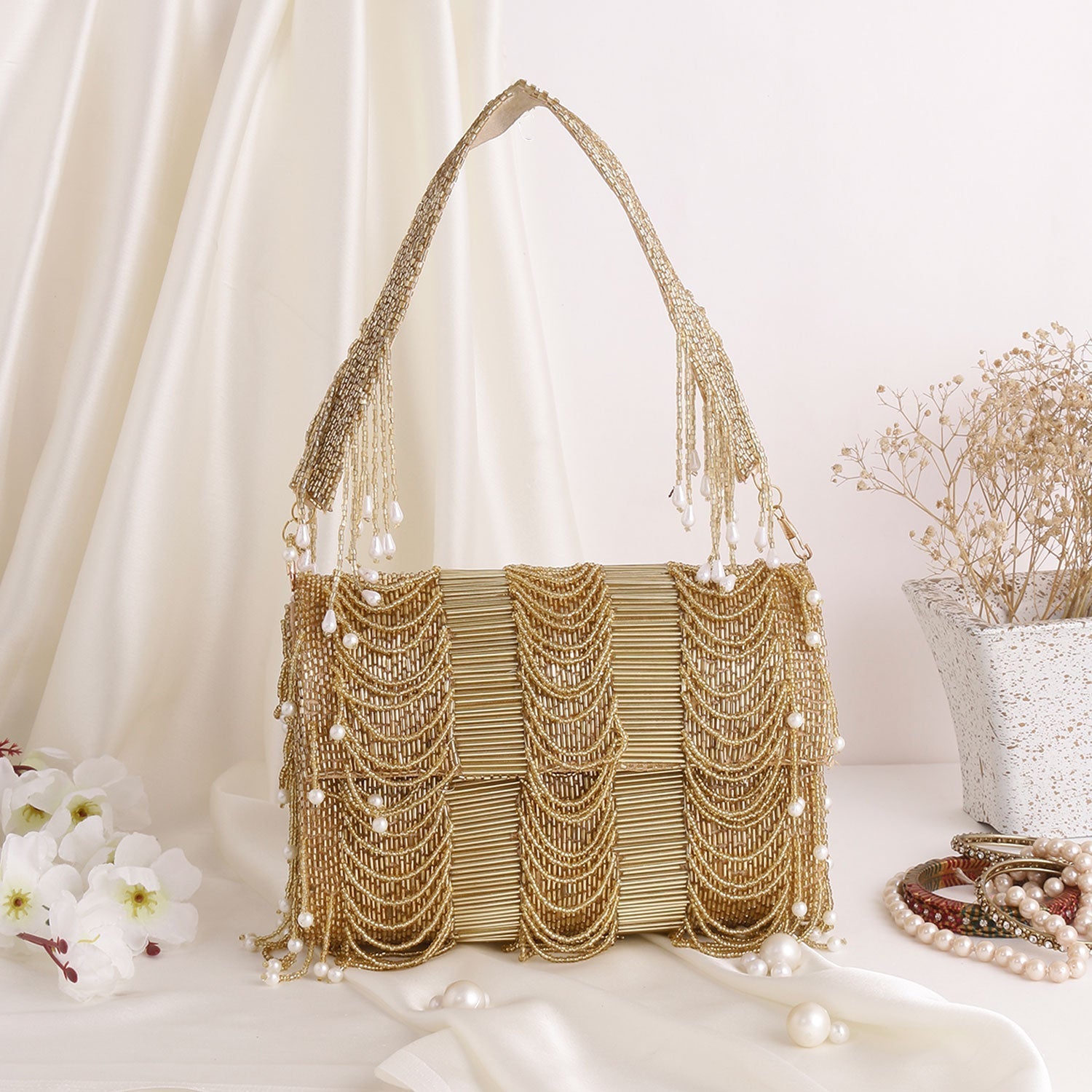 Stylish Allover Golden Work Flap Clutch Bag For Party , Wedding