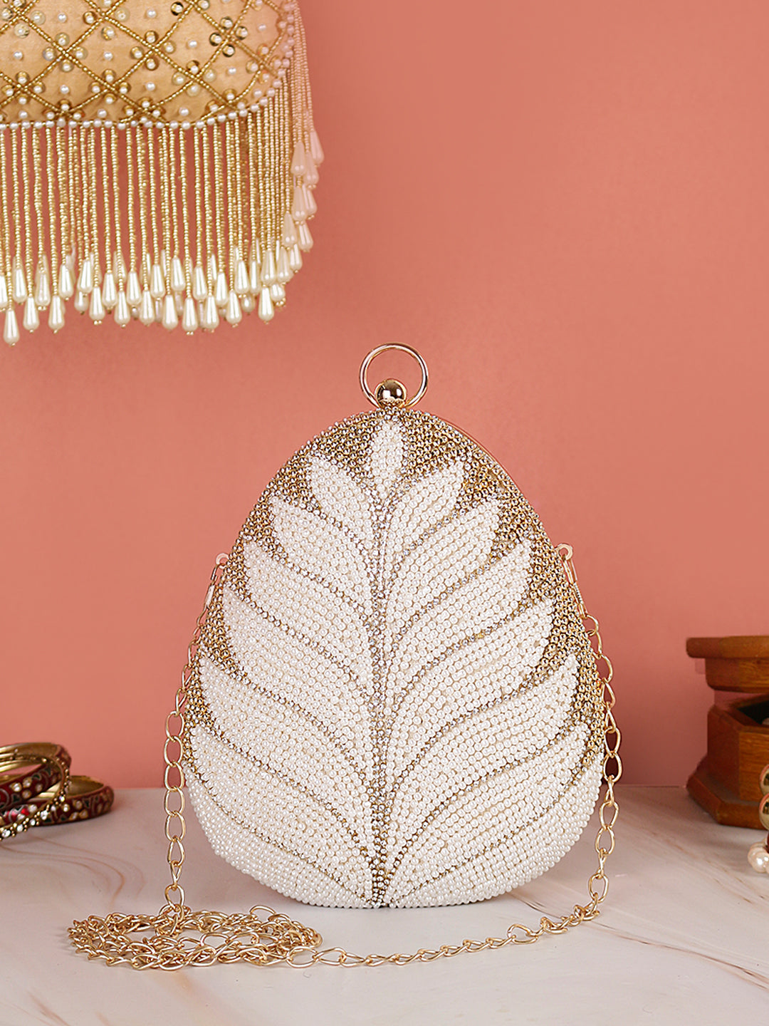 Designer handmade embroidery almond shape clutch